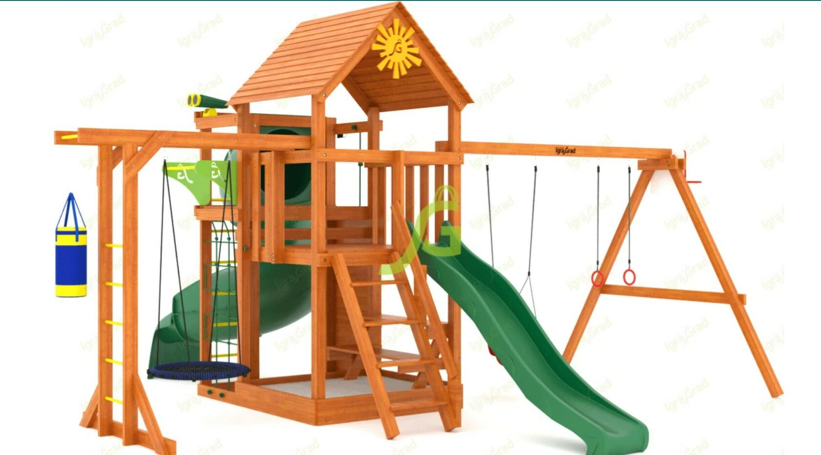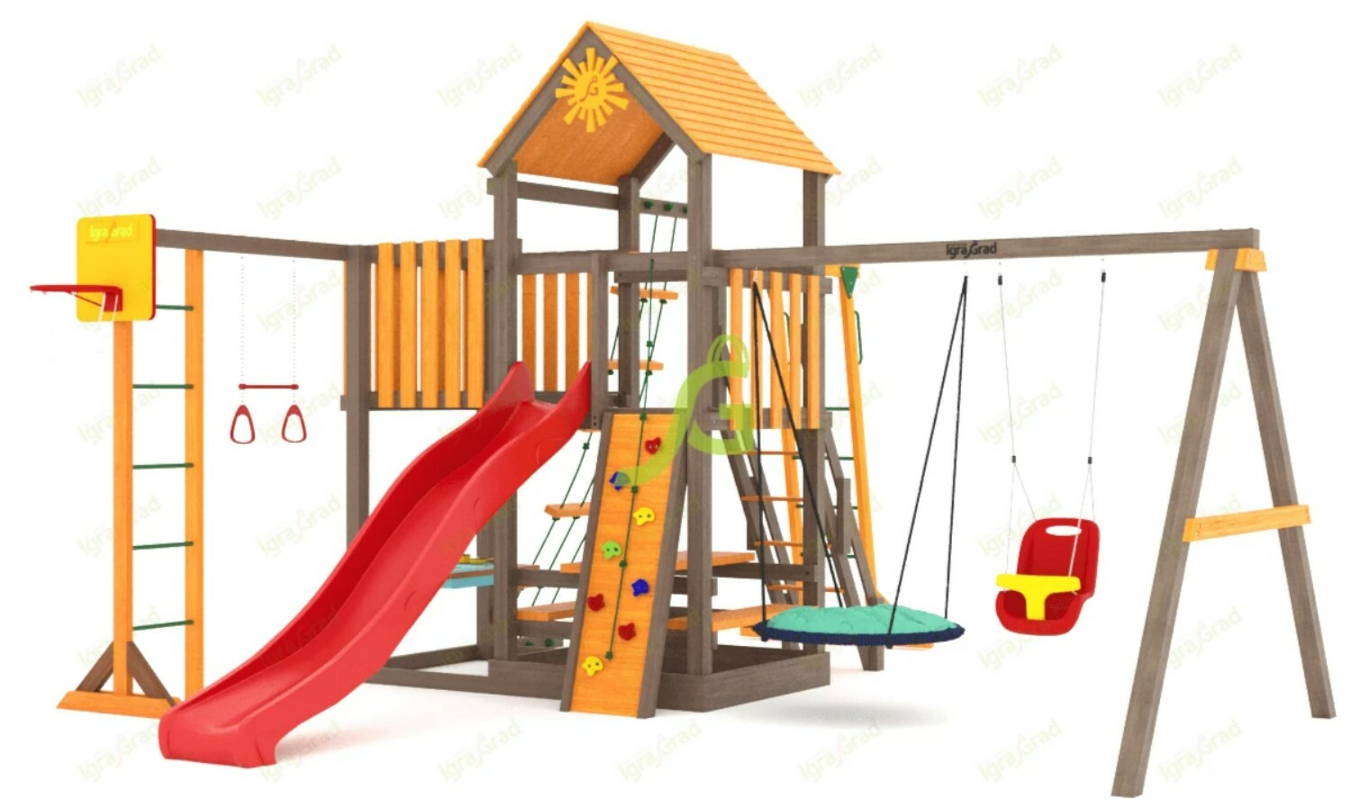 Детская площадка "IgraGrad Крафт Pro 4" – полезное удовольствие Исследовательский инстинкт и огромное желание залезть выше головы присуще абсолютно всем детям! И не надо их за это ругать! Причём в наше время нужно ещё и хвалить малыша за то, что он исследует всё вокруг, а ни сидит за планшетом. Детская площадка IgraGrad Крафт Pro 4 – это то место, где можно безопасно проводить время: лазать вверх-вниз, качаться, играть с песком, кататься с горки. Преимущества игровой площадки от IgraGrad Функциональный модуль состоит из большого количества элементов, тщательно крепящихся друг к другу. Конструкция двухуровневой башни из клееного бруса камерной сушки 70х70 мм выдерживает максимальные нагрузки и подходит для времяпрепровождения большой компании детей. Преимущественный материал сооружения – дерево. Оно не нагревается под лучами солнца, имеет приятный эстетичный вид. Благодаря нетоксичной пропитке на водной основе древесина прослужит длительный срок, ведь она защищает материал от гниения, рассыхания, перепадов температуры и прочих негативных факторов. Горка, качели выполнены из высококачественного пластика, выдерживающего низкие и высокие температуры. Крепёжные элементы, металлические стяжки не ржавеют, выдерживают высокие нагрузки. Каждый снаряд игровой конструкции направлен на оздоровление и укрепление иммунитета: